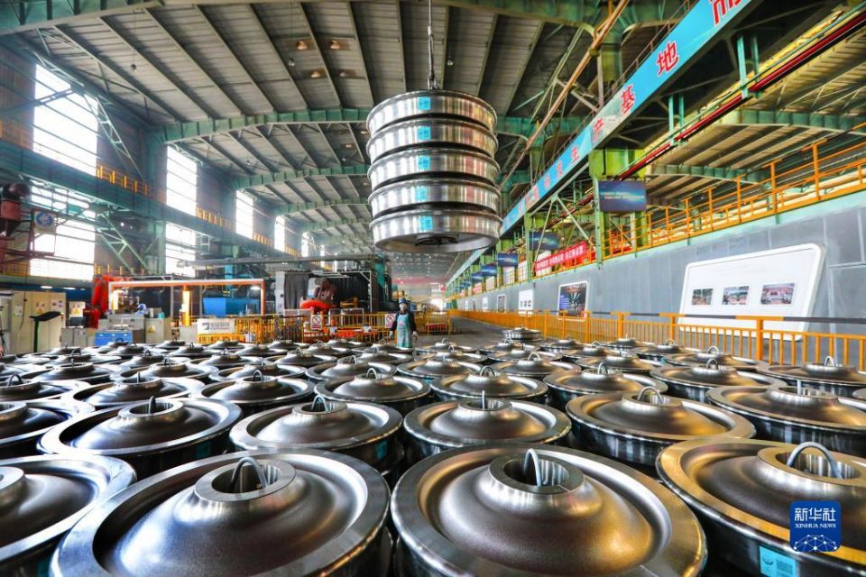 位于安徽省马鞍山市的宝武集团马钢轨交材料科技有限公司里,生产线上一派火热:轧钢履带火花四溅,钢锭被无人行车送入上料轨道,机械手把钢坯投入1100℃以上的加热炉……一道道严苛的工序后,锃亮的重载车轮下线,准备出口国际市场。