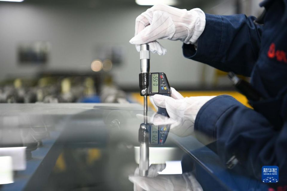 在位于安徽省蚌埠市的蚌埠中建材信息显示材料有限公司内,工作人员在测量超薄电子信息显示玻璃的厚度(2021年12月21日摄)。新华社记者 张端 摄
