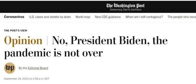 “不,拜登总统,新冠疫情还没结束”。图片来源:《华盛顿邮报》评论文章截图