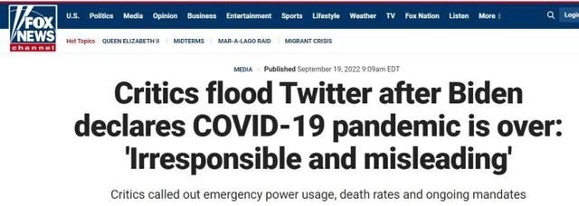 拜登宣布美国疫情结束后,批评者涌入推特,称其言论“不负责任和误导”。图片来源:福克斯新闻网报道截图