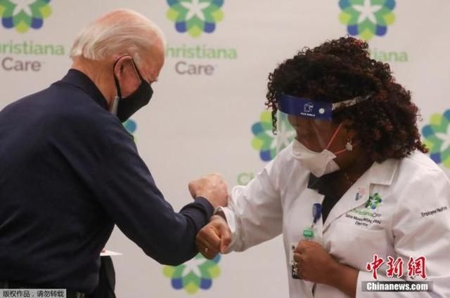 资料图:拜登与疫苗接种工作人员碰肘以示感谢。