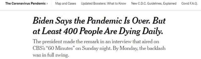 美国总统拜登宣布新冠疫情结束,但美国每天仍有至少400人死于疫情。图片来源:《纽约时报》报道截图