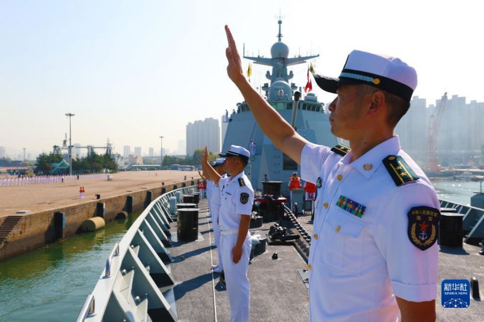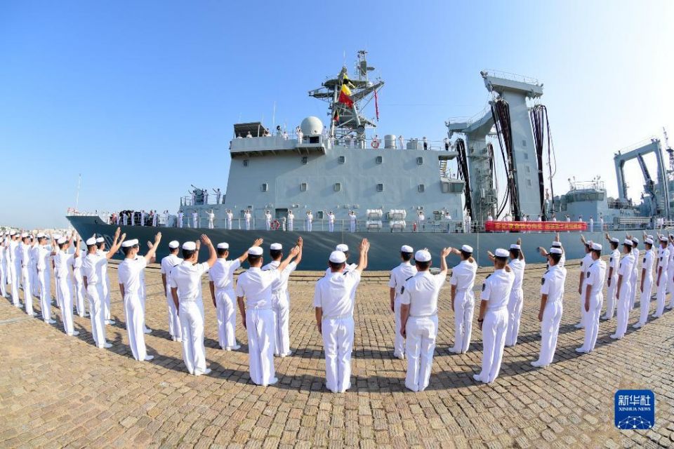 上午9时许,护航编队舰艇缓缓驶离码头,任务官兵在甲板上整齐列队,挥手向祖国和亲人告别。