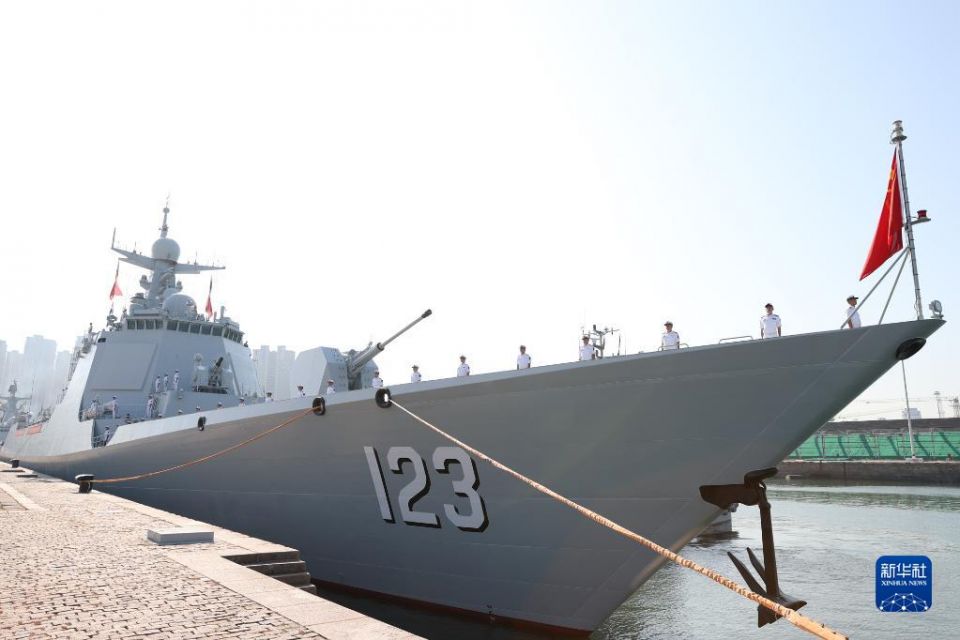 9月21日,中国海军第42批护航编队从山东青岛某军港解缆起航。这是编队中的淮南舰。新华社发(马玉彬 摄)