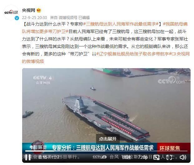 首页 战斗力达到什么水平?军事专家:三艘航母达到人民海军作战最低需求 2022-09-26 08:36:06 分享 来源:央视网目前人民海军已经有了三艘航母,这三艘航母加在一起,战斗力达到了什么样的水平?从航母编队上来看,未来可能会有哪些变化?军事专家张军社表示,三艘航母其实刚刚达到一个这种作战最低的需求。从它的舰艇编队来讲,那么还会有新的,更多的这种“带刀护卫”。