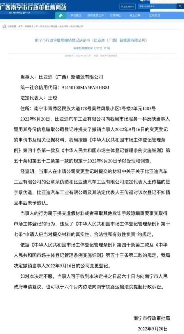 近日,广西南宁市行政审批局的一则公告显示,9月20日,比亚迪汽车向该局市场服务一科反映“比亚迪(广西)新能源”冒用其身份信息骗取公司登记,并提交了撤销“比亚迪新能源”变更登记的申请书及相关证据材料。