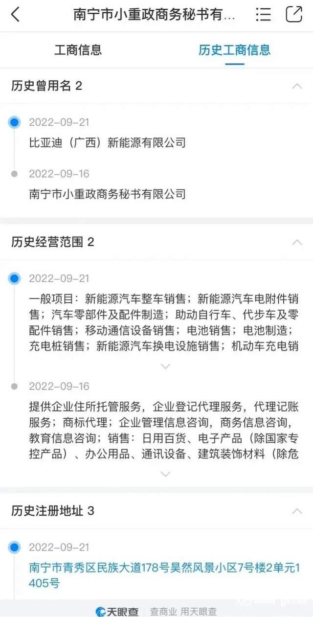 这家“碰瓷”比亚迪的公司,此前名为南宁市小重政商务秘书有限公司。