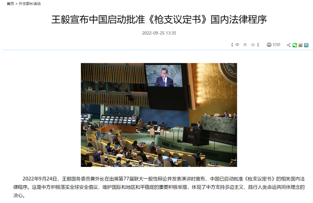 2022年9月24日,王毅国务委员兼外长在出席第77届联大一般性辩论并发表演讲时宣布,中国已启动批准《枪支议定书》的相关国内法律程序。这是中方积极落实全球安全倡议、维护国际和地区和平稳定的重要积极举措,体现了中方支持多边主义、践行人类命运共同体理念的决心。