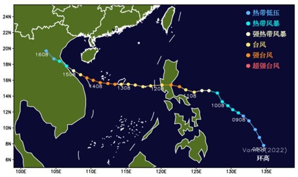 (2)台风“环高”2020年11月9日下午在菲律宾以东洋面上生成,登陆菲律宾(强台风级)后穿过南海中部海域,之后在越南沿海登陆(强热带风暴级,见图4)。“环高”造成菲律宾因灾死亡101人,失踪10人。