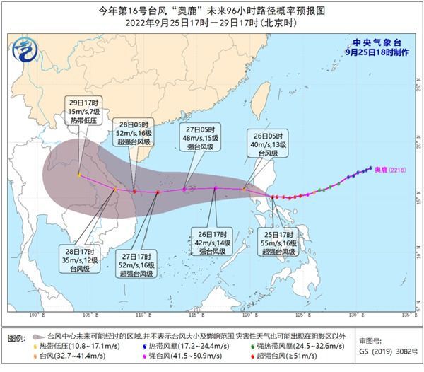 预计, “奥鹿”将以每小时25公里左右的速度向西偏北方向移动,将于今天晚上在菲律宾吕宋岛东部沿海登陆(48~55米/秒,15~16级,强台风级或超强台风 级),今天夜间穿过吕宋岛,强度有所减弱,26日早晨到上午进入南海中东部海域,之后向偏西方向移动,逐渐向越南东部沿海靠近,强度还将有所加强,28日 早晨到上午在越南东部沿海登陆(48~52米/秒,15~16级,强台风级或超强台风级),登陆后强度快速减弱。中央气象台9月25日上午发布台风蓝色预 警。