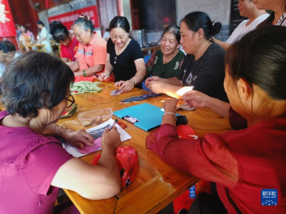 在湖南省郴州市汝城县沙洲瑶族村的就业技能培训现场,村党支部书记、村委会主任朱向群(右)帮绣花的村民在纸板上描摹图案(2022年9月19日摄)。新华社记者 周楠 摄