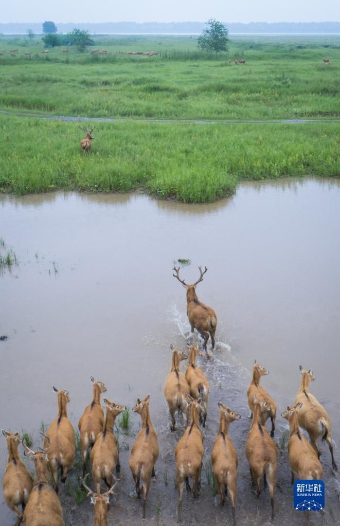 一群麋鹿在石首麋鹿国家级自然保护区内活动(2021年5月17日摄,无人机照片)。新华社记者 肖艺九 摄