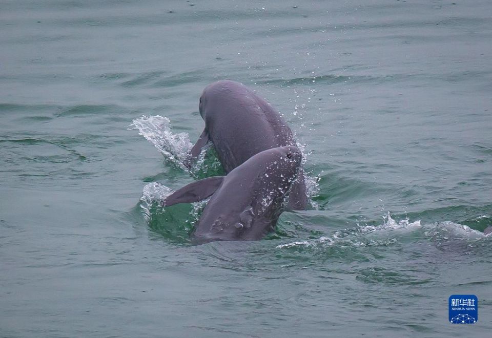 在湖北省宜昌市,长江江豚在水中嬉戏(2021年5月10日摄)。新华社记者 肖艺九 摄