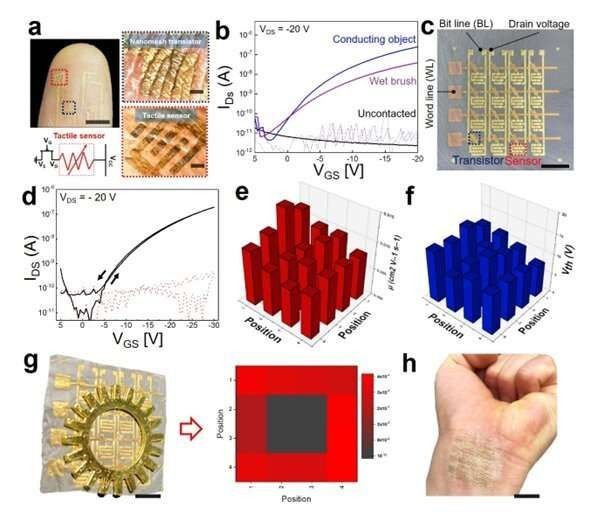 韩国大邱 庆北科学技术院(DGIST)研究团队成功开发出了世界上第一个纳米结构电子皮肤设备(有机场效应晶体管)。这种电子皮肤设备包含仅一个纳米的网状结构, 可长时间测量和处理生物信号,且不会让佩戴者感觉不适。这一成果标志着科学家们向电子皮肤设备集成系统迈进了一大步。相关研究刊发于最新一期《高级功能材 料》杂志。