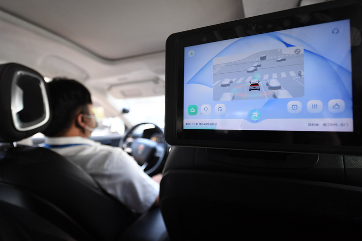 智能网联汽车内部,车上的屏幕会实时显示路况信息。 新华社记者薛宇舸摄于2022年8月15日