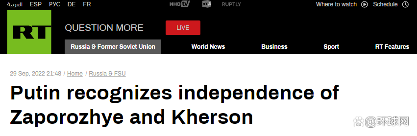 RT称,此举发生在普京30日签署条约承认上述两地以及顿巴斯两个地区为俄罗斯领土的正式仪式之前。