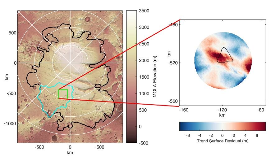 模型产生的地形起伏与实际航天器观测结果之间的相似之处,以及早先的冰层穿透雷达证据表明,火星南极冰盖下有积聚的液态水,火星地下的岩浆活动相对较近,以使水保持液态。