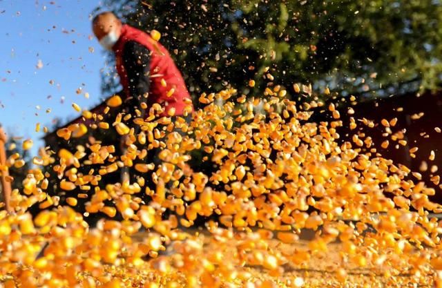 农民在翻晒收获的玉米