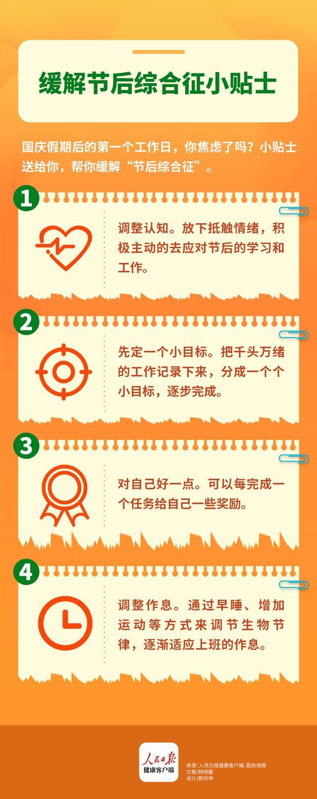 “缓解假期综合征,主要还是要调整认知,积极主动地去应对节后的学习和工作,可以把目标定的小一点,不要一下给自己太大的压力。”谷力群建议,可以把自己节后千头万绪的节后工作记录下来,分成若干个小目标再一个个去完成,这样会缓解大量工作带给自己的压力。节后投入工作后可以对自己好一点,可以每完成一个任务给自己一些奖励。