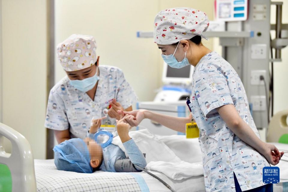 在 山东省枣庄市妇幼保健院儿童ICU病房,医护人员为完成靶向治疗药物诺西那生钠的4岁脊髓性肌萎缩症患儿加油鼓劲(2022年1月1日摄)。诺西那生钠注 射液是我国首个获批治疗脊髓性肌萎缩症的进口药物,2019年进入中国市场时,每针价格近70万元。在2021年国家医保目录药品谈判中,以3.3万元每 针的价格进入新版医保药品目录。新华社记者 郭绪雷 摄
