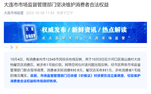 10 月4日,有消费者向市12345市民投诉热线反映,其于10月3日在沙河口区南山渔村大排档餐饮店消费后,被多收1毛钱价款。网络空间也对该问题出现反 映。经市区两级市场监督管理部门联合现场调查,消费者实际消费930.9元,餐饮店实收931元,多收消费者1毛钱的情况属实。目前,市场监督管理部门已 依据《价格法》对该餐饮店立案调查,切实维护消费者合法权益和市场良好秩序。