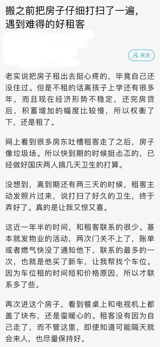 “看到太多房东吐槽租客走后房子像是垃圾场,我心里本来挺忐忑的,做好了国庆搞几天卫生的打算了。结果,到了房子一看,整个被惊讶到了,打扫得比自己家都干净,真的是遇到神仙租客了。”房东说。
