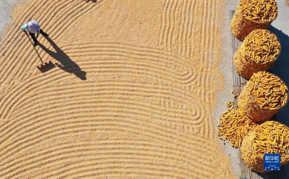 首页 我们的田野——最美秋色是丰收 2022-10-11 07:59:18 分享 10月10日,山东省临沂市郯城县郯城街道农民在晾晒收获的玉米(无人机照片)。金秋时节,稻谷金黄,瓜果飘香。人们在田间地头忙着收获,留下一幅幅美丽的秋日丰收图。新华社发(张春雷摄)