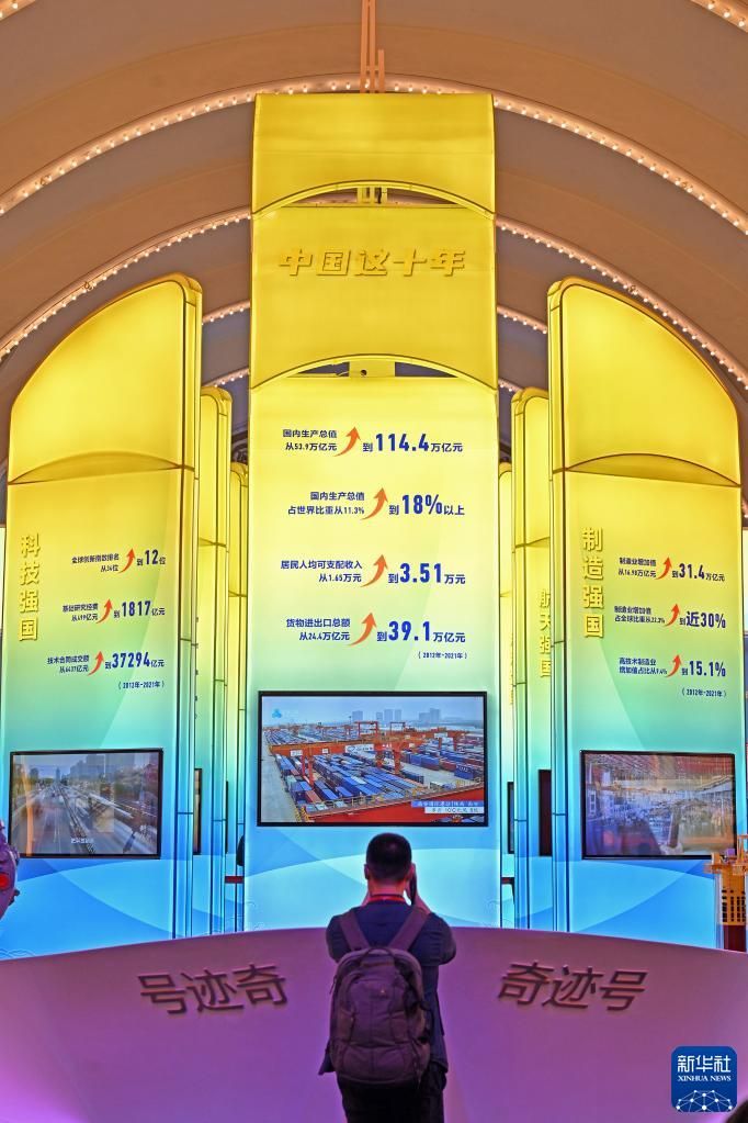 在“奋进新时代”主题成就展的中央综合展区,一艘中国经济“奇迹号”巨轮模型吸引了参观者的目光。在时代洪流中奋楫扬帆,于惊涛骇浪中行稳致 远,非凡十年深刻启示:正是因为确立了习近平同志党中央的核心、全党的核心地位,确立了习近平新时代中国特色社会主义思想的指导地位,党才有力解决了影响 党长期执政、国家长治久安、人民幸福安康的突出矛盾和问题,消除了党、国家、军队内部存在的严重隐患,从根本上确保实现中华民族伟大复兴进入了不可逆转的 历史进程。