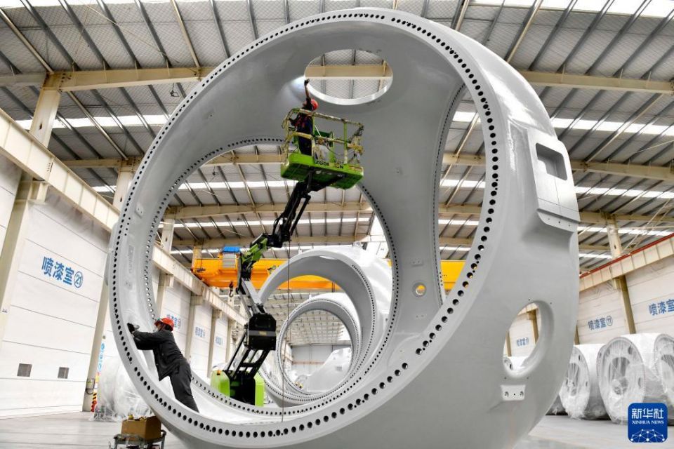 在山东省惠民县风电装备产业基地涂装车间,工作人员对风电轮毂进行涂装(2022年6月7日摄)。新华社记者 郭绪雷 摄