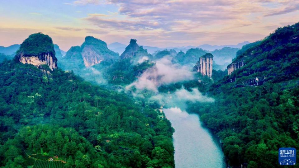这是福建武夷山九曲溪两岸的丹霞景观(2022年6月7日摄,无人机照片)。新华社记者 姜克红 摄