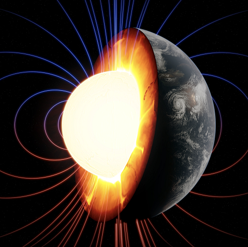 早期地球的内部剖面图,突出了其主要的地球动力学过程。磁场线由产生它们的液体核心发出的蓝色和红色绘制,而板块构造力重新排列了表面,并在下方岩石地幔的搅动循环中发挥作用。图片来源:哈佛大学地质学家亚历克·布伦纳