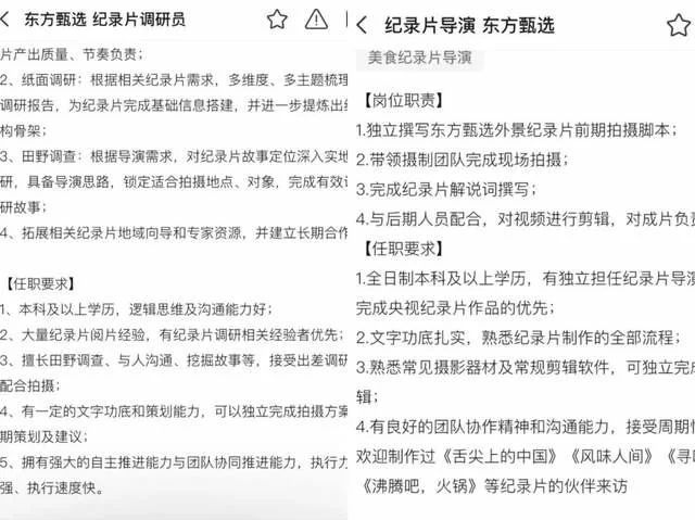 从招聘要求来看,美食记录片风格定位类似于《舌尖上的中国》,东方甄选特意表明非常欢迎制作过《舌尖上的中国》《风味人间》等美食纪录片的伙伴前来应聘,对纪录片调研员的要求也是需要擅长田野调查、与人沟通、挖掘故事等。
