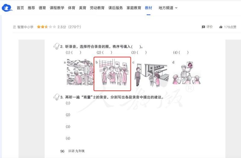 澎湃新闻核查发现,网友所述插图来自人教社出版的义务教育教科书日语九年级全一册第96页。在这页的第二道听力选择题的选项“b”中,有四名穿着篮球衣的男生,其中左一至左三三名男生的球衣编号分别为7、3、1,左四男生侧身站立,未显示出球衣编号。