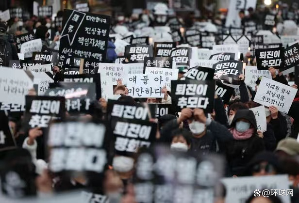 《朝鲜日报》称,多人举着的标语牌上写着“辞职就是追悼”