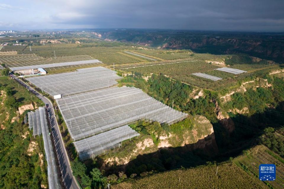 这是9月20日拍摄的陕西延安市洛川县旧县镇的苹果林(无人机照片)。新华社记者 邵瑞 摄