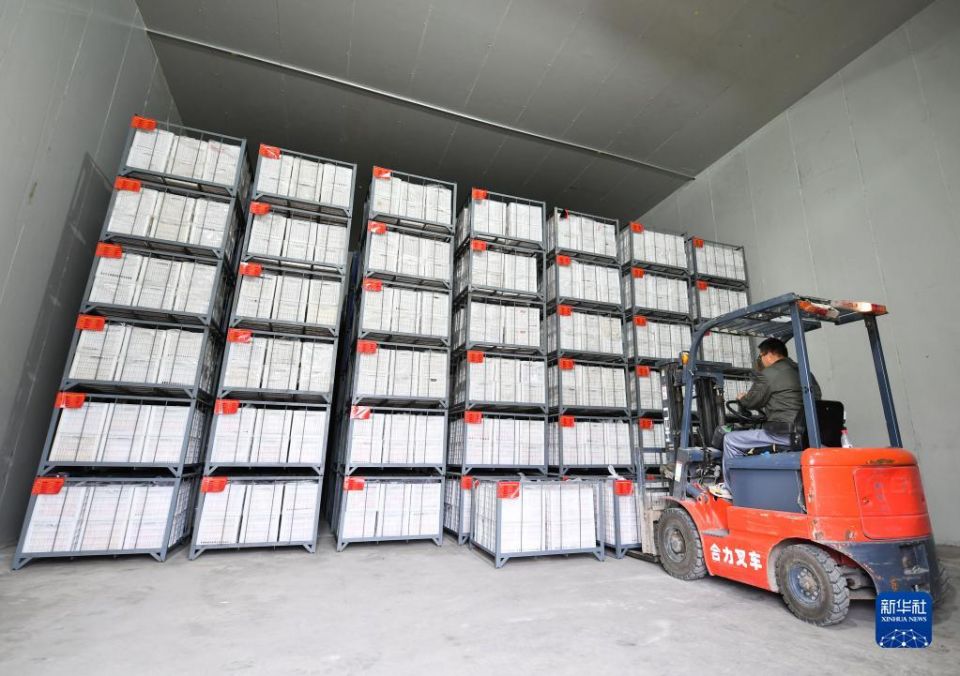 10月27日,在陕西延安市安塞区高桥镇南沟村,工作人员在冷库搬运苹果。新华社记者 张博文 摄