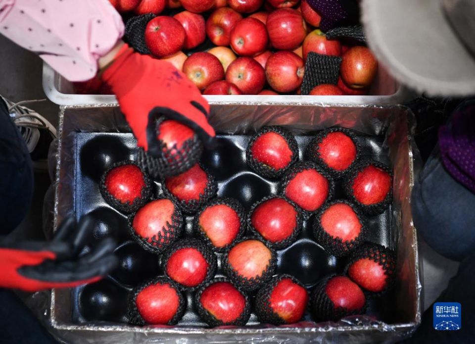 10月27日,在陕西延安市安塞区高桥镇南沟村,工作人员在苹果洗选车间装箱打包苹果。新华社记者 张博文 摄