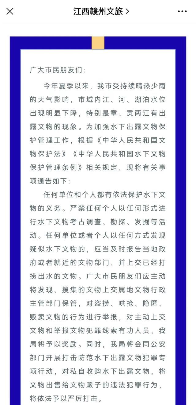 11 月2日,赣州市文物部门发布《关于加强水下出露文物保护管理的通告》。通告称,任何单位和个人都有依法保护水下文物的义务。严禁任何个人以任何形式进行水 下文物考古调查、勘探、发掘等活动。任何单位或者个人以任何方式发现疑似水下文物的,应当及时报告当地政府或者就近的文物部门,并上交已经打捞出水的文 物。市民朋友们应主动将发现、搜集的文物上交属地文物行政主管部门保管,对盗捞、哄抢、隐匿、贩卖文物的行为进行举报,对主动上交文物和举报文物犯罪线索 有功人员,将予以奖励。