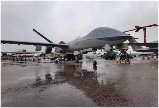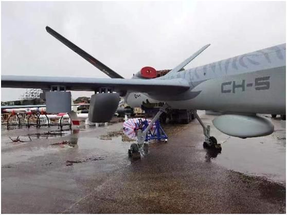 话说彩虹-5不算是新面孔了。这种采用大平直翼布局的察打一体无人机此前多次参加珠海航展,也已经出口到多个国家。它的飞行高度为2000-5000米,最大飞行时间超过35小时,最大起飞重量3.3吨,任务载荷为480公斤,可以挂载射手系列精确制导弹药。