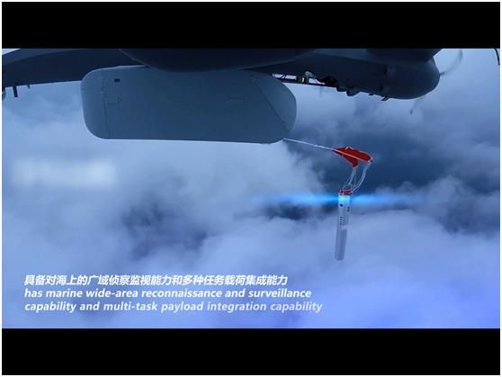 在彩虹无人机公司在本届航展上发布的官方视频里,老司机找到了线索:海洋应用型彩虹-5无人机飞临海面后,从机翼挂载的吊舱里投下一枚声呐浮标!