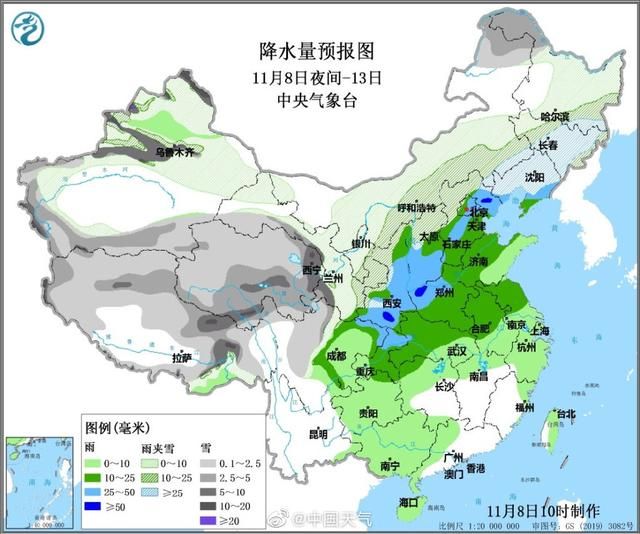 11月8日夜间至13日全国降水量预报图。(来源:中央气象台)
