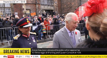 据《独立报》、《卫报》等英媒当地时间9日报道,英国国王查尔斯三世和王后卡米拉当天在约克郡访问时,有抗议者向其投掷鸡蛋,并大喊“这个国家是建立在奴隶制的鲜血之上的!”。有目击者称抗议男子扔了大约4、5个鸡蛋,但无一命中,随后被警方逮捕。