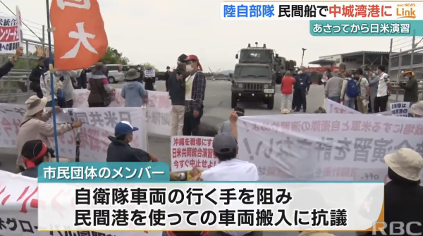 综 合《冲绳时报》、《琉球新报》等媒体9日报道,日本自卫队和驻日美军10日在西南诸岛举行代号为“利剑”大规模联合军演,参演自卫队的装备8日已通过船舶 运抵冲绳县中城湾港。《冲绳时报》称,8日当天有多名当地居民聚集到中城湾港的大门前,抗议日美举行军演(上图)。当天,冲绳警方出动约100名警员将抗 议民众“强行带走”,现场附近一度陷入混乱。