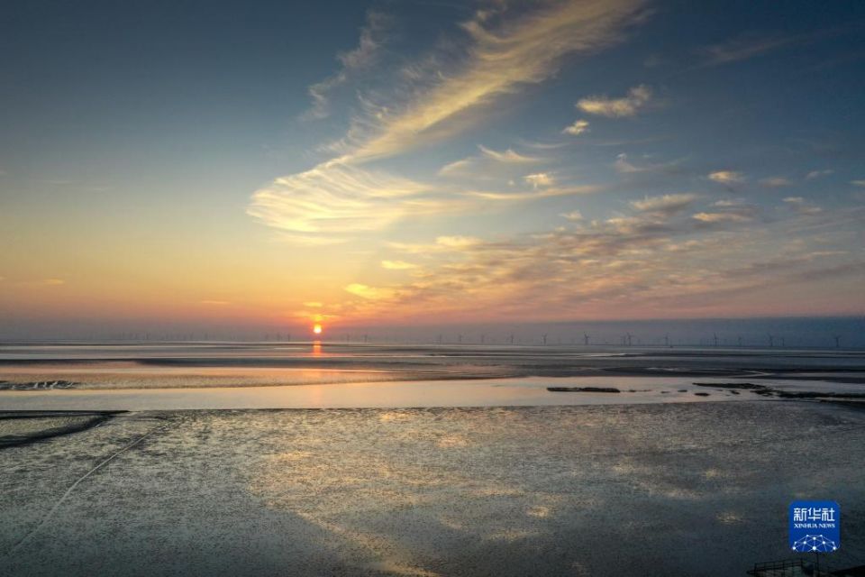 盐城东台条子泥湿地日出景象(11月9日摄,无人机照片)。