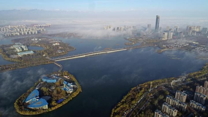 11月12日,“塞上湖城”宁夏银川上空出现平流雾景观,宛若仙境。新华社记者 王鹏 摄