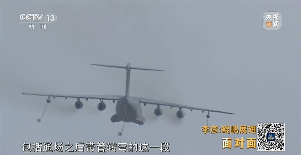 李彦:我们带管拖曳通场,包括通场之后带管转弯的这一段,也是我们之前设计的,就是想体现出这型加油机可以和小飞机在配合加油的过程中,边转弯边加油。