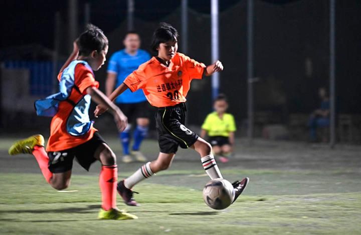 今年初,柳州民间公益足球教练走进柳江区进德镇太小平屯,利用周末的时间教孩子们踢足球,从此点燃了乡村少年的足球梦想。由于没有场地,孩子们只能 在篮球 场上训练,经常有孩子摔倒擦伤。今年7月起,在太小平屯乡村振兴理事会的提议下,村民们先后集资8万多元,组成义务劳动队,把村后一块荒地建设成为孩子们 的专用足球场。场地建成后,爱心人士还为他们捐赠了人工草坪、灯光等设施,让乡村少年有了专属的灯光足球场。黎寒池摄(人民图片网)
