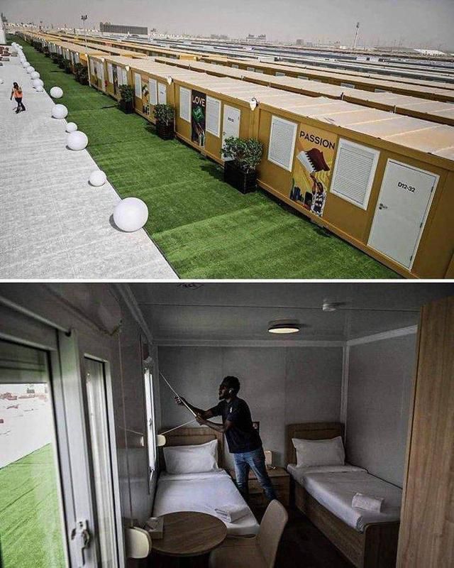 而在离多哈机场不远的区域,还修建起了6000个类似集装箱样式的板房,也可以供球迷入住。房间内除了两张床,还有床头柜、小桌子、空调,以及带淋浴的卫生间。