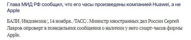 俄罗斯外交部发言人扎哈罗娃14日发布与俄外长拉夫罗夫在印尼巴厘岛的视频,辟谣西方媒体称拉夫罗夫住院的假新闻。而视频中,拉夫罗夫疑似佩戴苹果智能手表,使用苹果手机的画面又被一些西方媒体关注。塔斯社、《莫斯科共青团员报》、《俄罗斯报》等多家俄媒最新消息称,拉夫罗夫14日称,他戴的手表不是苹果制造的,而是华为制造的。