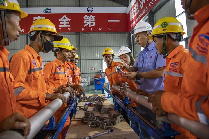 11月13日,在印度尼西亚万隆,印尼员工在中国中铁电气化局雅万高铁资源管理中心学习中国标准“简统化”接触网零部件装配工艺。新华社发